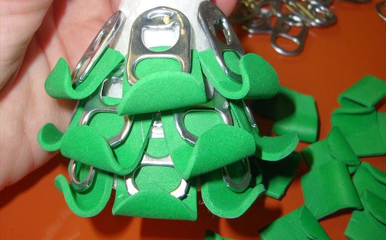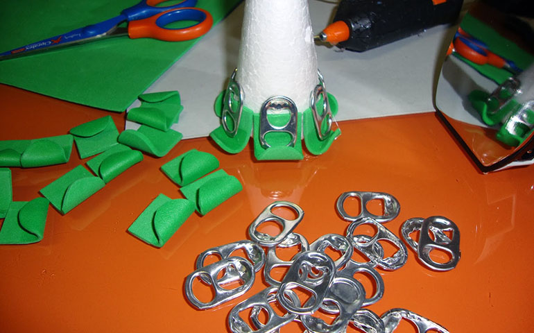 3º Ahora llega la parte donde se necesita más paciencia. Llega la hora de pegar las hojas y las anillas. Empezaremos por la parte de abajo e iremos haciendo filas hacia arriba. Primero haremos una fila de hojas y la siguiente será de anillas, dejando una parte por encima de las hojas y la otra se quedará oculta. Conforme vayamos subiendo, podeis recortar un poco las hojas para que encajen bien. Todo se pega con un poco de silicona.
