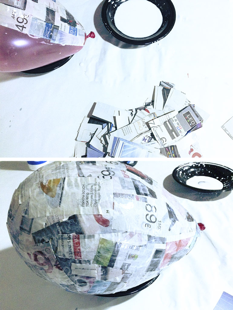 2º Bañamos las tiras de periódico y las vamos pegando en el globo. No metais todo el periódico a la vez en la mezcla, pues se hará una pasta.