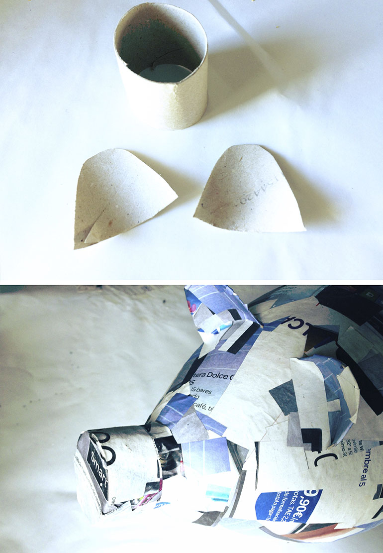 5º Con otro tubo hacemos la nariz y las orejas de nuestro cerdito. Para las orejas hemos abierto el tubo.