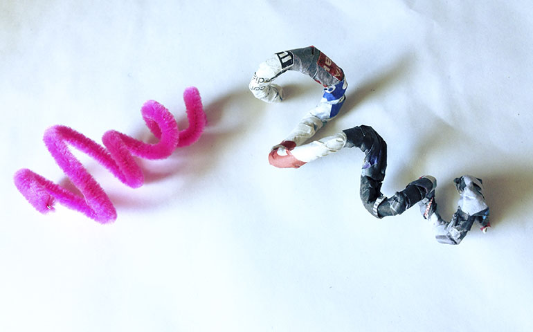 7º Ahora vamos a hacer la colita. Para ello necesitamos un limpiapipas al que le daremos forma de espiral. Una vez tengamos la forma deseada lo cubriremos con el papel de periodico y cola blanca.