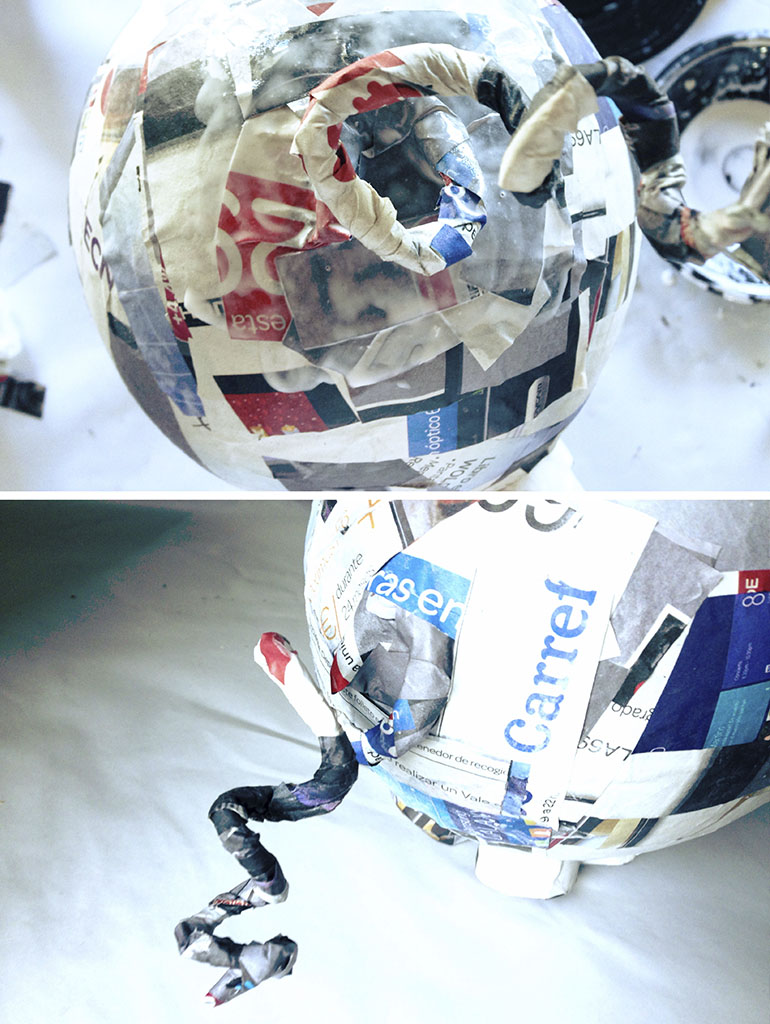 4º Colocamos las patas en su sitio (podeis cortar los bordes de los tubos para que se adapten mejor al globo) y las vamos pegando con el periódico.