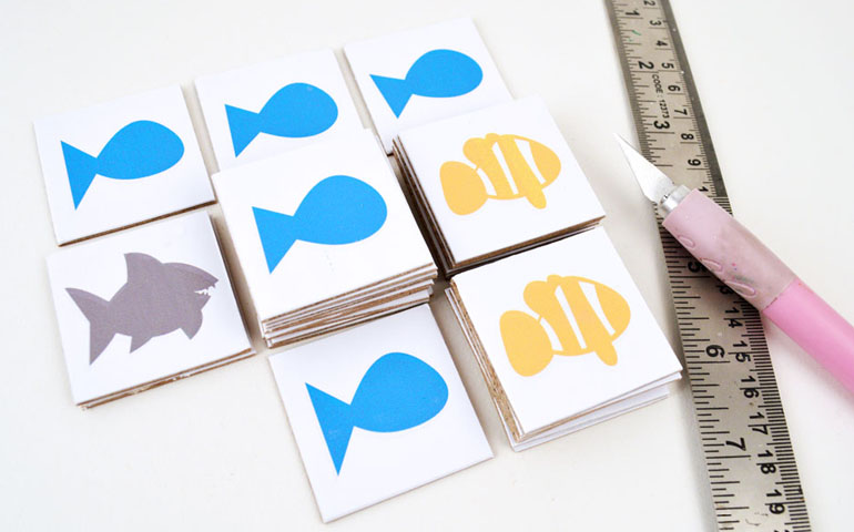 - Con el barniz seco podrás cortar los cuadraditos y ya tendrás tu juego de parejas.