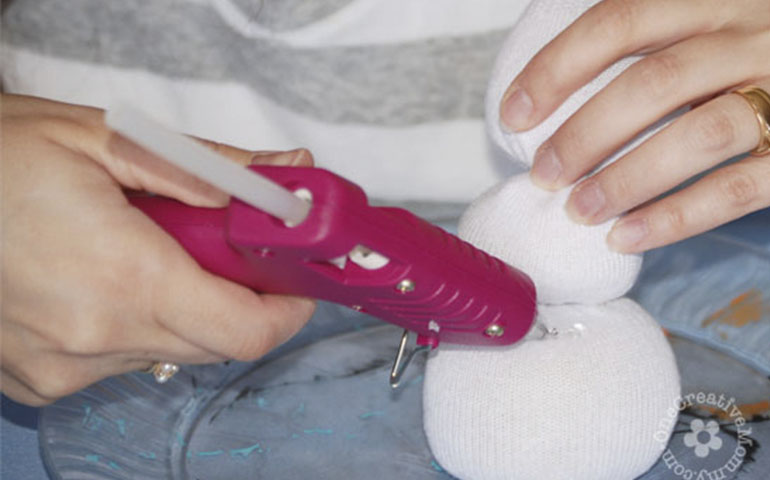 5º Con la pistola de silicona pegaremos las bolas entre sí para que Olaf mantenga su forma.