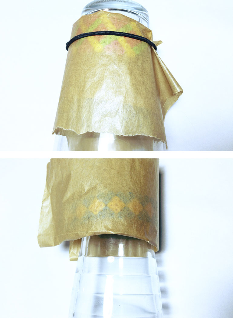 Mientras esté caliente colocamos la pieza rodeando el vaso y la sujetamos con una goma. Una vez se haya enfriado podemos quitar la goma y el papel.